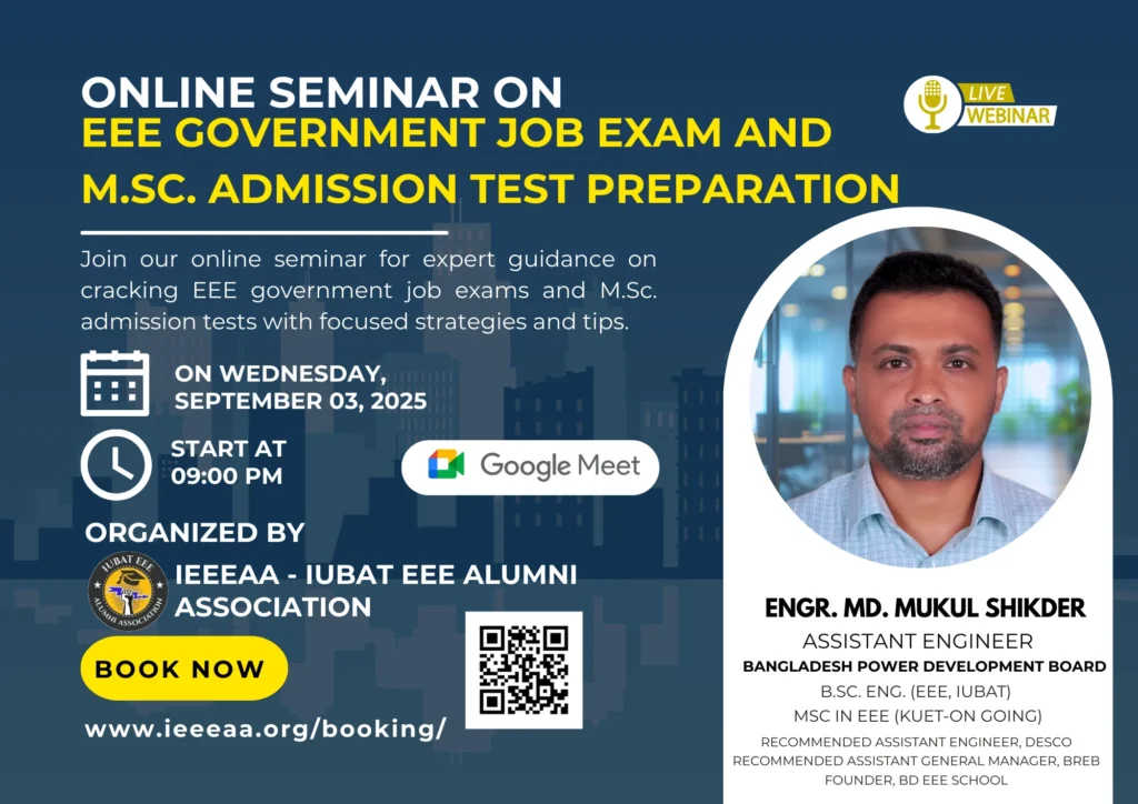 31 Aug Webinar Online Seminar On EEE Government Job Exam & M.Sc. Admission Test Preparation Posted by Engr. Md Abdullah An Noman September 1, 2025 0 Online Seminar On EEE Government Job Exam & M.Sc. Admission Test Preparation Join our online seminar for expert guidance on cracki... Continue reading