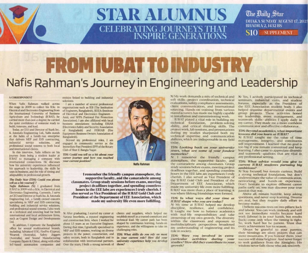 17 Aug News Engr. Nafis Rahman, President (IEEEAA) has been featured in The Daily Star β Star Alumnus. Posted by Noman August 23, 2025 1 We are proud to share that our alumnus and President of IEEEAA - IUBAT EEE Alumni Association, Mr. Nafis Rahman, has been featured in T... Continue reading